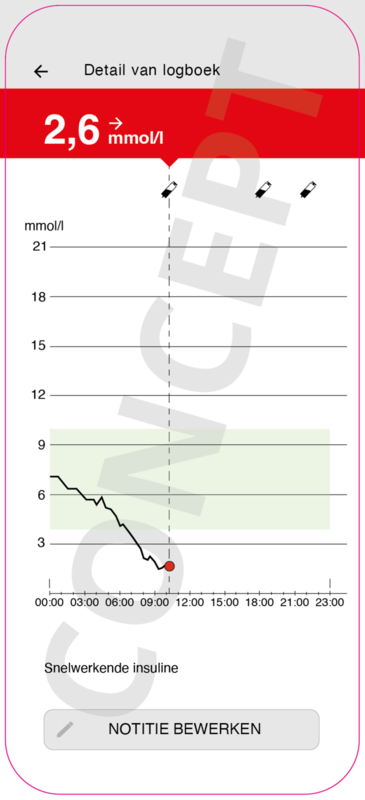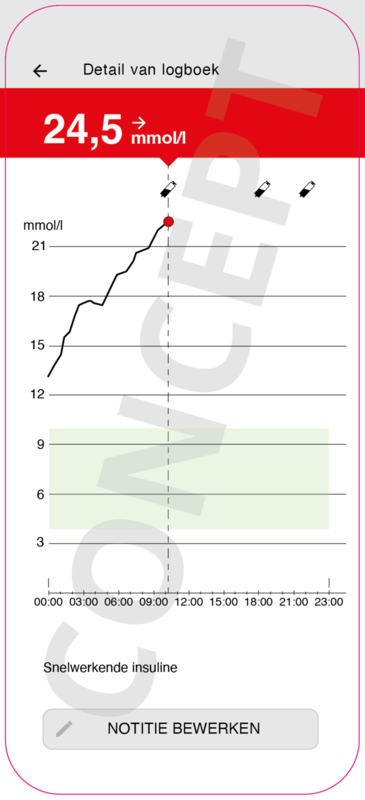 Deze realistische sticker toont een smartphone-app die een hyperglykemie (suikerpiek) situatie simuleert.